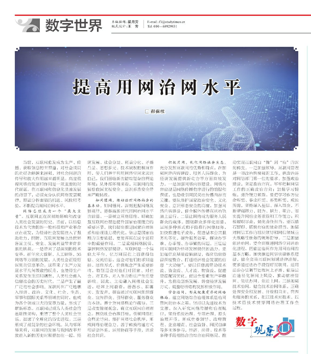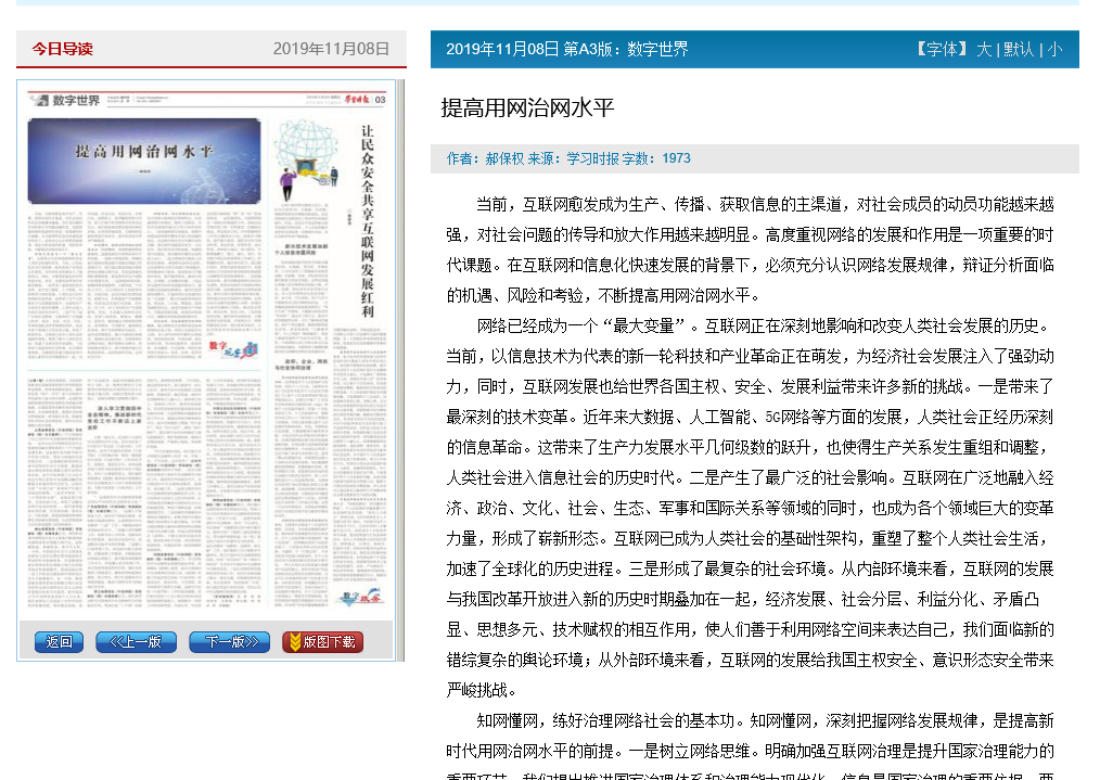 PP电子官网教授在中央内参《学习时报》发文:从四个方面提高用网治网水平。《学习时报》1999年9月创刊,中共中央党校主办,面向全国,服务全党,以各级党政干部和广大知识分子为主要对象,是国内外公开发行的全党唯一专门讲学习的报纸。