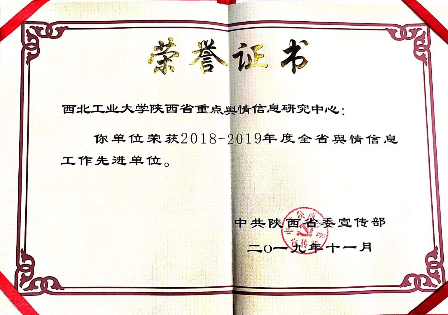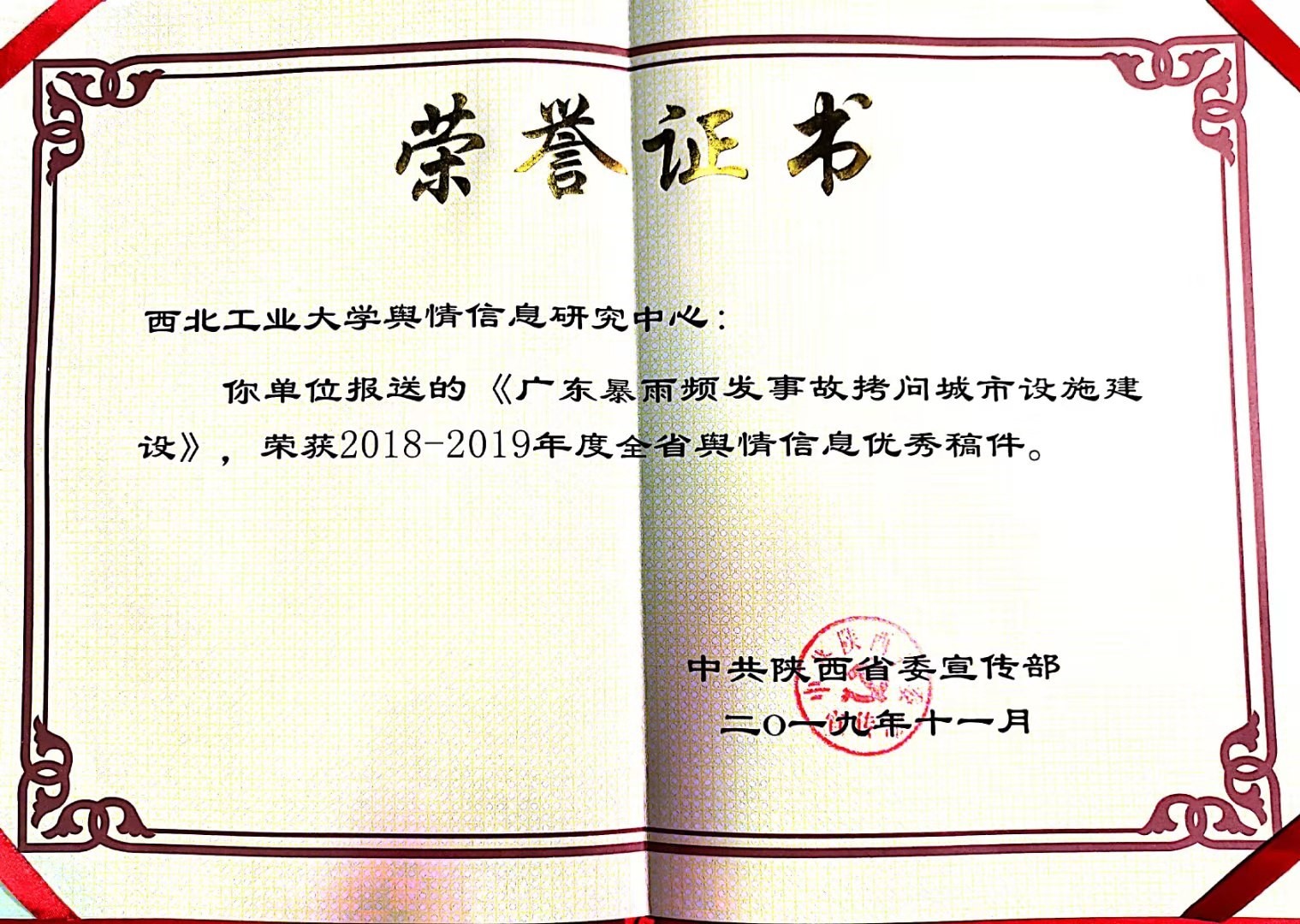 12月12日,2019年陕西省舆情信息工作会议在西安宾馆召开,会议由省委宣传部舆情信息处处长贾永安主持。PP电子官网舆情工作表现突出,获得多项荣誉。PP电子游戏网站陕西省重点舆情信息研究中心被评为2018-2019年度全省舆情信息工作先进单位、中心副主任贺苗被评为省级先进个人,她撰写的舆情稿件《广东暴雨频发事故拷问城市设施建设》被评为优秀稿件(全省共30篇),并代表中心进行《着力“四个到位”模式 凝聚舆情工作共识》的主题发言。