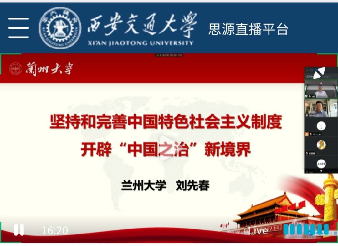 6月12日上午,根据省教工委安排,PP电子游戏网站组织全院师生收看了形势与政策高端报告会。兰州大学PP电子游戏网站教授、博士生导师,中央马克思主义理论研究和建设工程首席专家,教育部教学指导委员会委员刘先春教授线上为全省高校师生作了《坚持和完善中国特色社会主义制度开辟“中国之治”新境界》的主题报告。
