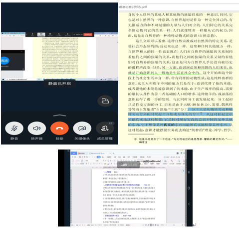 读书会开始,主持人首先回应了往期读书会中,大家提出的问题,在查找资料和请教老师的基础上,对往期读书会的遗留问题:《德意志意识形态》一书谁是主导者,德意志意识形态在文本中的含义,性质以及特征等,做了详细解答。随后,马淑欣同学分享了《德意志意识形态》第二节的读书笔记,并向大家分享了张奎良教授的一篇文章“《德意志意识形态的十大亮点-----纪念《德意志意识形态》170周年”,与第二节内容结合,重点介绍历史的实践展开,人类历史的四个前提:全部人类历史就在物质资料生产、扩大再生产、人口生产和意识生产四个前提下全面地展开了。其中,人口生产内在地包含社会关系的再生产,因此人类历史上的四个前提也可以看作物质资料生产、精神生产、人口生产和社会关系生产。人类历史就是在这四种生产的相互交织、紧密配合中展开的。滕洋洋同学分享了读《德意志意识形态》第二节的感受,提出了自己认为比较难懂的章节和问题。