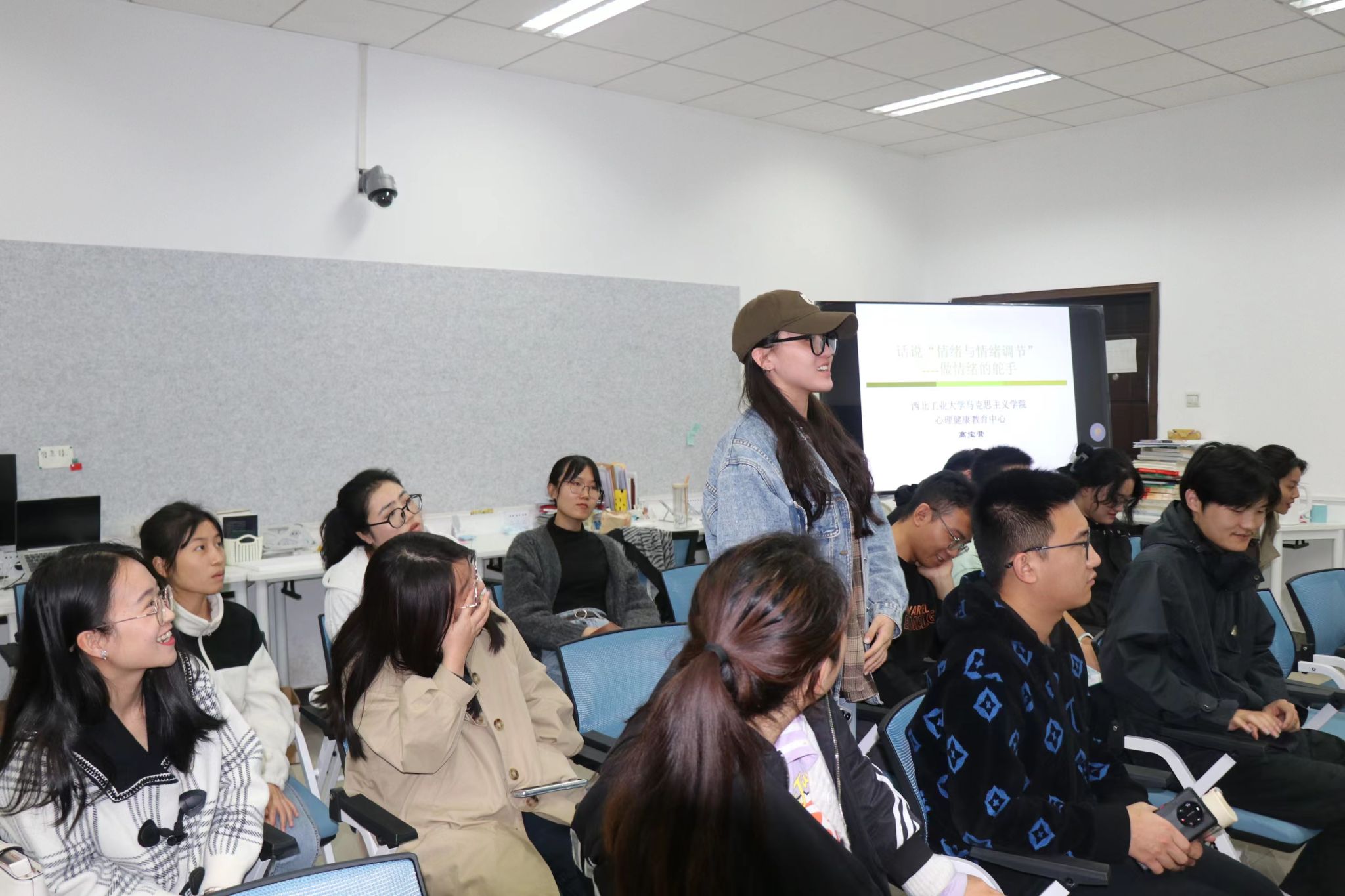 在与高老师的互动交流环节,师生踊跃提问,涉及“情绪与情理关系的处理”“为什么成年后越来越难感到快乐?成年人如何增强快乐感?”“如何看待近期较流行的‘悲秋综合征’这一说法”等问题。从心理学的角度,高老师对每一个问题提出了自己的专业见解,启发我们要提高法理意识,注重个人情绪管理和调节;在需要多元化多样化的时代,适当放慢生活节奏,品味和享受需要满足后的快乐感与满足感;主观情绪受外部环境(如季节)的影响,但是不能一味放大这种影响等。