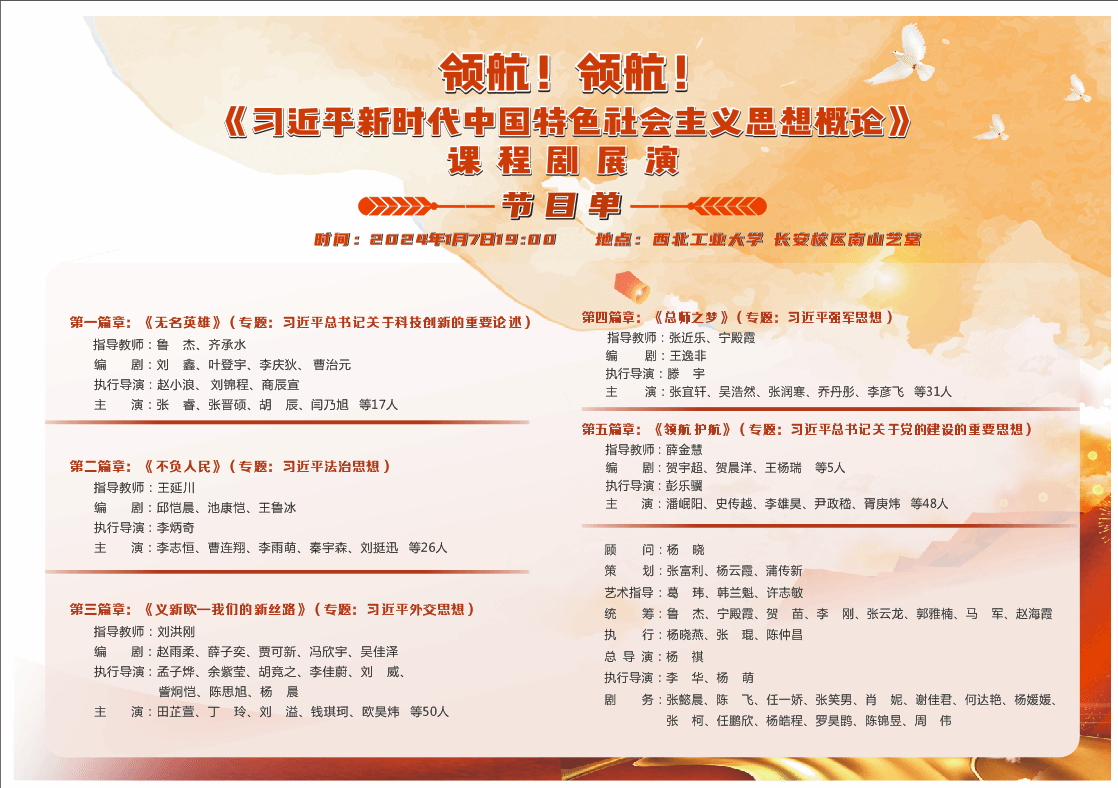 2024年1月7日晚,由中共陕西省委文明办、中共陕西省委教育工委主办,PP电子游戏网站承办的“领航!领航!《习近平新时代中国特色社会主义思想概论》(以下简称《概论》)课程剧”在PP电子游戏网站长安校区南山艺堂举行。