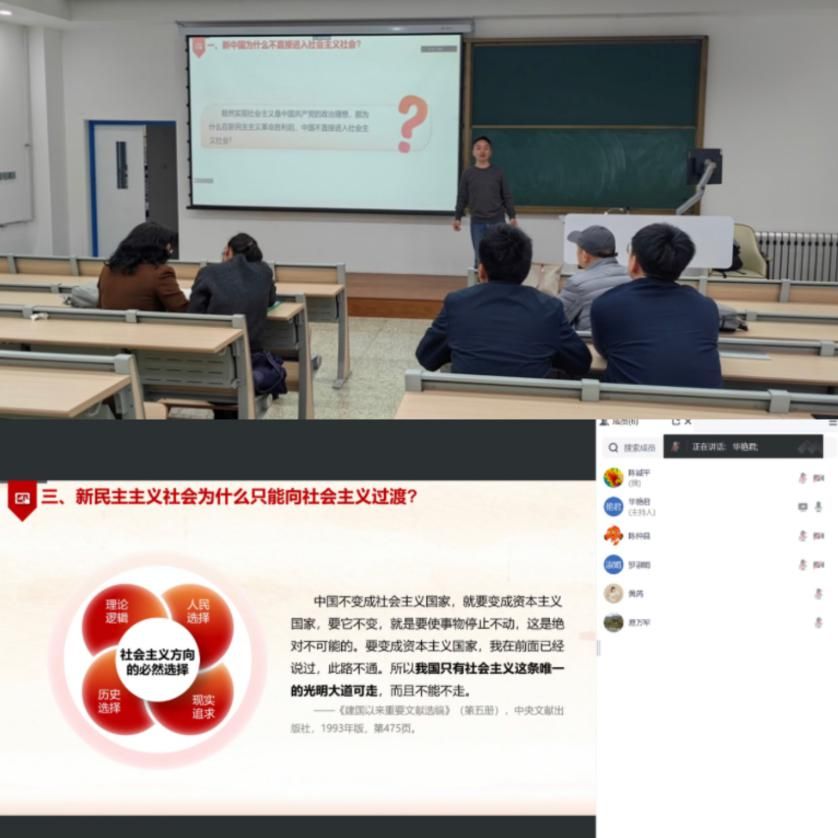 中国近现代史基本问题研究系于3月15日晚,通过线上与线下相结合的形式组织召开“习近平总书记思想政治理论课教师座谈会五周年”主题集体备课会。会议由系主任汪永平主持。会上,教学主任房小捷通报了学校和学院关于建设“育人文科”、实现院内外资源联动打造“大思政”格局、进一步做好思政课改革创新的要求和部署。接着,教师代表赵海霞从“以研促教”、“教学相长”、发挥教师主导和学生主体有机结合、充分利用学校及陕西丰富资源四个方面,做了如何贯彻落实习近平总书记“八个相统一”要求的报告。2023年陕西省思政课大练兵“教学能手”房小捷进行教学展示。随后,全体参会人员根据学校和学院的各项指导意见,围绕如何进一步实现“八个相统一”要求,不断加强“总师育人文化”引领作用,结合《中国近现代史纲要》课程教学改革进行了深入讨论,就教学案例库建设、教学环节改进、筹设小班研讨课、线上课程推进、提高备课会实效、教学改革课题申报、数字化课程资源建设形成了今后一段时间的具体工作计划和保障落实措施。