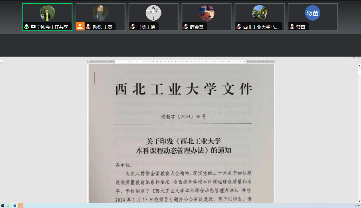 随后,《概论》课教研室主任宁殿霞副教授就关于印发《PP电子游戏网站本科课程动态管理办法》的文件与各任课老师围绕总则、动态管理对象、课程建设与开设管理、课程过程管理、预警与退出机制等内容进行集体学习。本次学习有利于任课老师们深入贯彻全国教育大会精神,落实党的二十大报告关于加快建设高质量教育体系的要求,全面提升学校本科课程建设质量和水平。