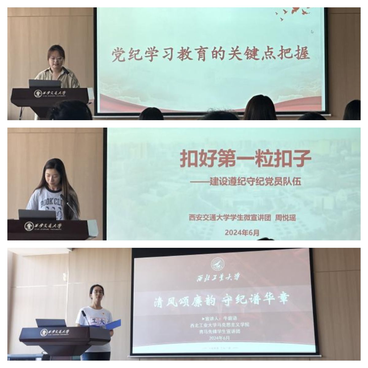 为深入学习贯彻习近平新时代中国特色社会主义思想,推进党纪学习教育走深走实、入脑入心,引导全体党员学纪、知纪、明纪、守纪,进一步丰富党纪学习教育形式,2024年6月15日上午于西安交通大学兴庆校区,PP电子游戏网站PP电子游戏网站学生党支部、西安交通大学人文社会科学学院硕3118和3120班联合党支部、西北农林科技大学人文社会发展学院社会学硕士研究生党支部,三校联合开展“党纪教育强党性、联学共建促提升”主题党日活动。