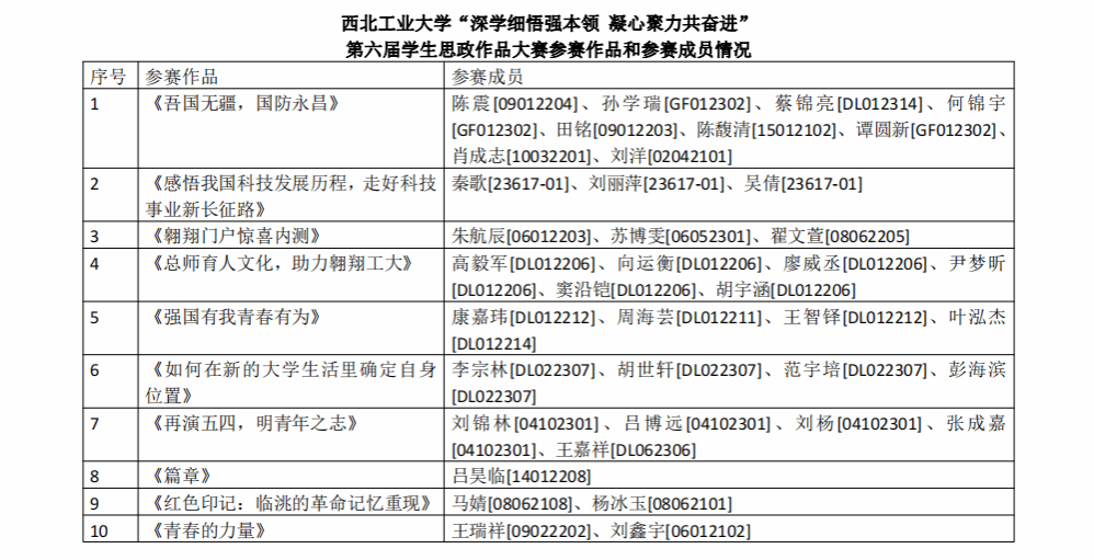 为扎实有效推进学习贯彻习近平新时代中国特色社会主义思想主题教育,深刻理解和把握习近平新时代中国特色社会主义思想的真理力量和实践伟力,引导PP电子官网学生在深学细悟中提高理论素养,坚定理想信念,厚植爱党爱国情怀,在学思用贯通、知信行统一中锤炼过硬本领,勇于担当作为,切实将“学思想、强党性、重实践、建新功”的总要求落地落实,为强国建设、民族复兴凝心聚力。PP电子游戏网站党委学生工作部、PP电子游戏网站面向全校学生开展“深学细悟强本领 凝⼼聚力共奋进”第六届学生思政作品⼤赛。现将参赛作品和参赛成员予以公示。公示期间如有问题请向PP电子游戏网站相关负责人反映。