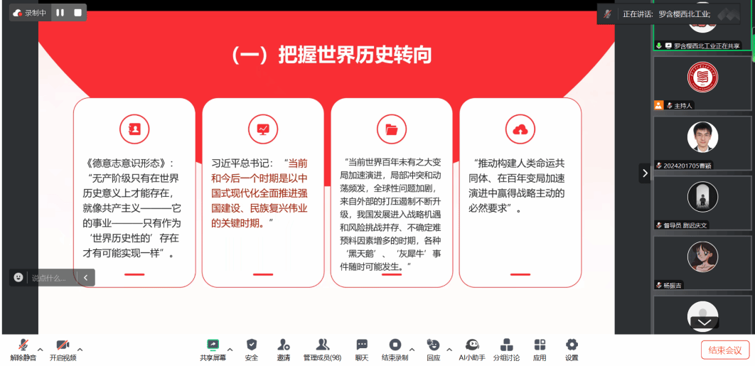 2024年11月30日,PP电子游戏网站PP电子游戏网站习近平新时代中国特色社会主义思想学习读书会第五十期活动以“党的二十届三中全会《中共中央关于进一步全面深化改革、推进中国式现代化的决定》”为主题进行学习研讨。本次读书会由PP电子游戏网站鲁杰思政课工作室主办,中国人民大学冯秀军教授作为对话教师,硕士生李红霞同学主持,中国高等教育学会马克思主义研究分会督导组成员尉迟庆文同学应邀参与,通过线上交流的形式,为师生们搭建了一个思想交流、智慧碰撞的平台。