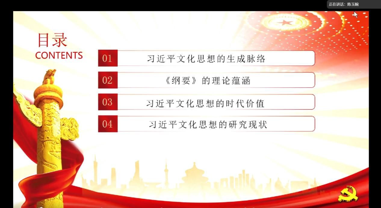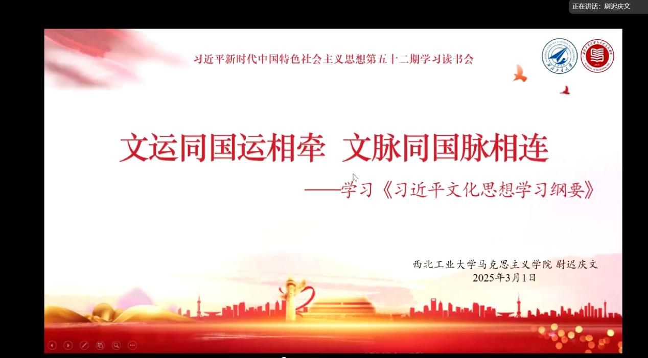 2025年3月1日,PP电子游戏网站PP电子游戏网站习近平新时代中国特色社会主义思想学习读书会第五十二期活动以《习近平文化思想学习纲要》为主题进行学习研讨。本次读书会由PP电子游戏网站鲁杰思政课工作室主办,中国科学技术大学魏荣教授作为对话教师,硕士生李红霞同学主持,通过线上交流的形式,为广大师生们提供了一个思想交流、深入学习、智慧碰撞的平台。