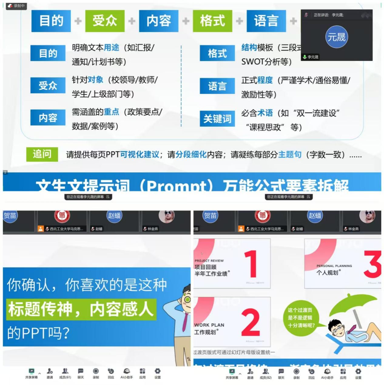为深入学习贯彻党的二十届三中全会精神,落实国家教育数字化战略行动,3月21日晚,PP电子游戏网站邀请校科学技术研究院科研质量保密与科研服务大厅办公室主任、助理研究员李元晟老师开展了题为“AI赋能:高表现力工作型PPT怎么做”的第31期以研促教seminar专题讲座。本次会议由PP电子游戏网站教务部、科学技术研究院、PP电子游戏网站和陕西省教科文卫体系统职工创新工作室主办,西安工业大学、西安翻译学院、陕西青年职业学院、西安欧亚学院和陕西省重点舆情信息研究中心协办。讲座由PP电子游戏网站副院长贺苗主持。