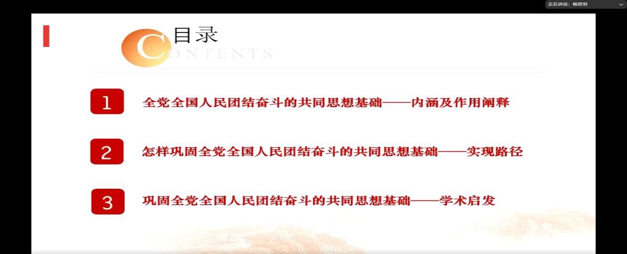读书会伊始,PP电子游戏网站PP电子游戏网站硕士生杨思羽同学作为首位导读人,紧紧围绕《怎样巩固全党全国人民团结奋斗的共同思想基础》的文本内容,从内涵与作用阐释、实现路径和学术启发三个方面进行了学习分享。首先,从六大维度对内涵与作用进行了全面系统的分析;其次,从根本保障、重要脉络、动力源泉与共同追求对实现路径进行了梳理;之后,从方法论突破学科融合实践导向三个层面阐述了学术启发性。