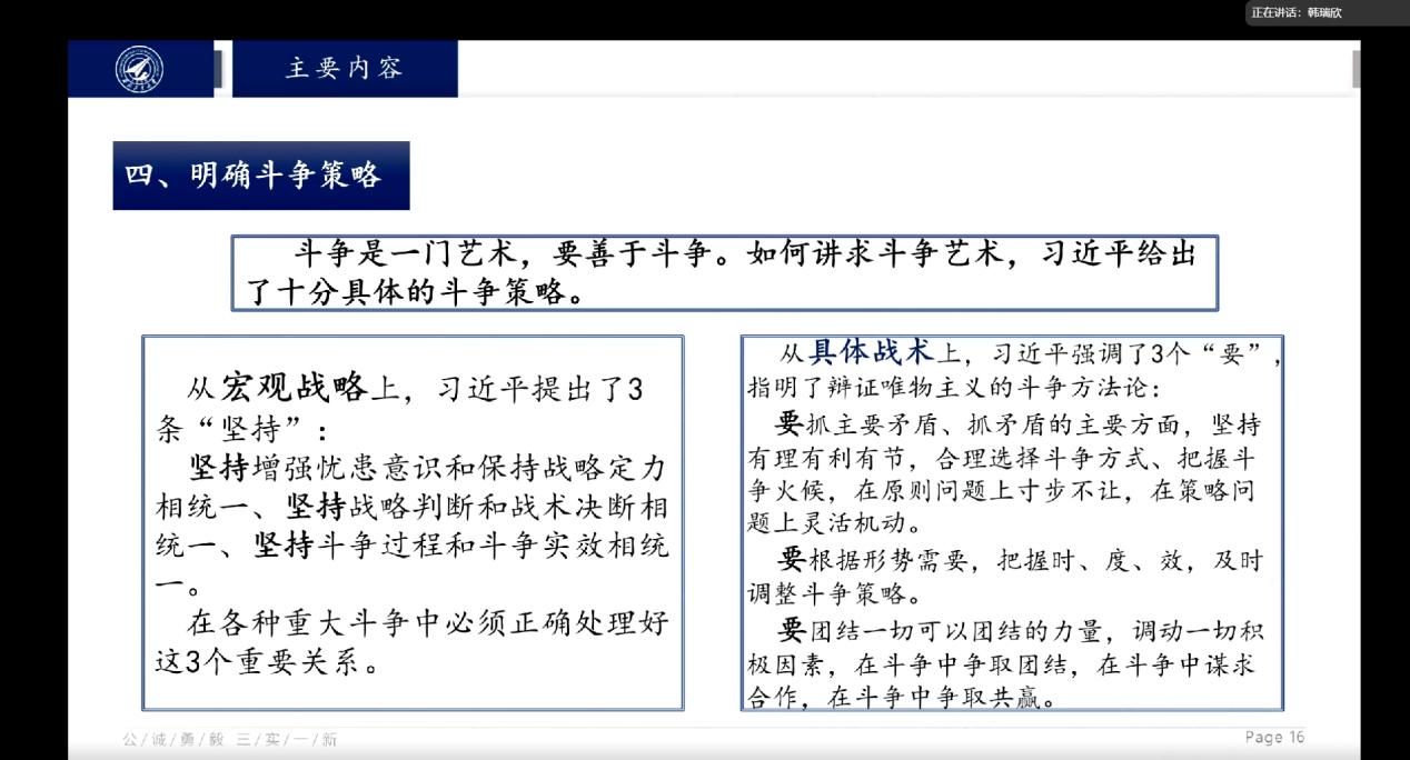 接着,PP电子游戏网站PP电子游戏网站博士生韩瑞欣同学,从围绕关于发扬斗争精神系列重要论述的文本梳理、关于发扬斗争精神系列重要论述的主要内容与关于发扬斗争精神系列重要论述的内在逻辑三个方面对文本内容进行了全面系统的解读。在内在逻辑方面,韩瑞欣同学思考深入,逻辑严谨,学术规范,具有较强的学理性,带给大家一定的启迪。