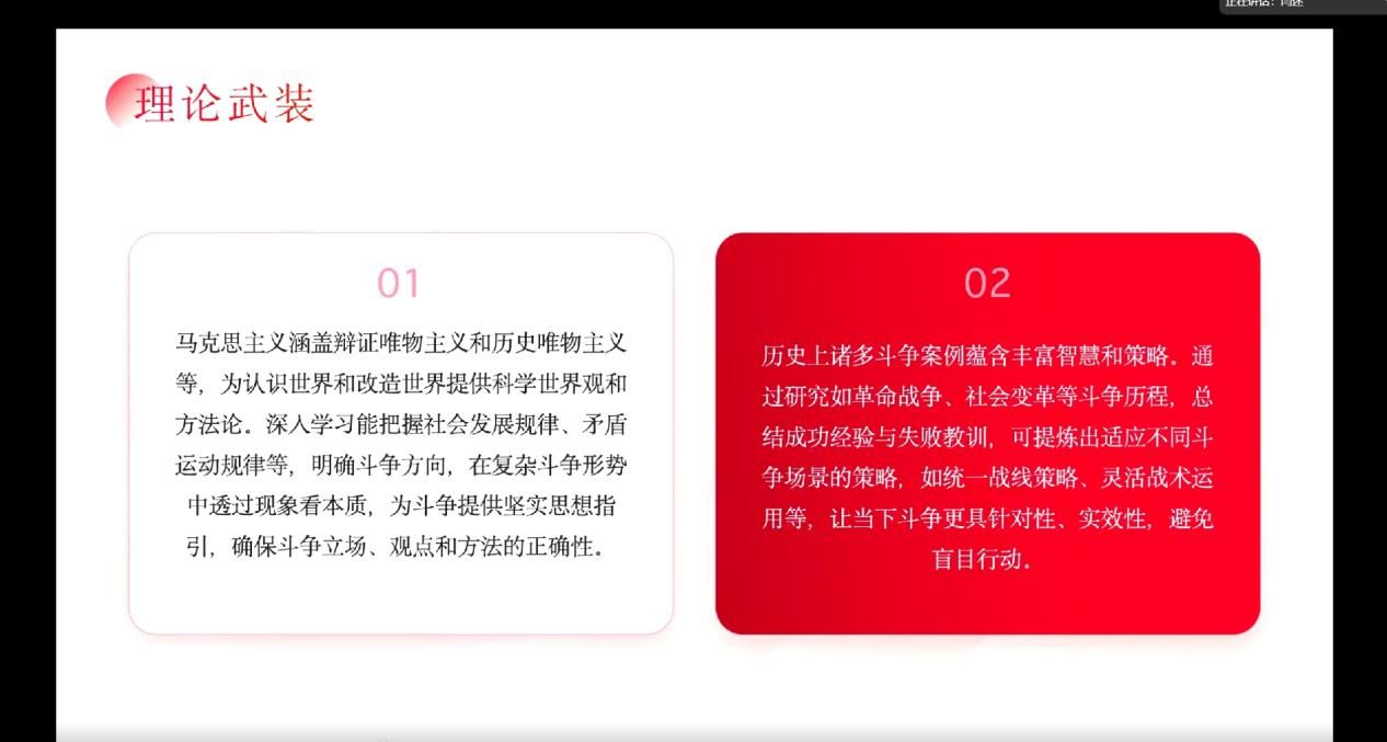 2025年5月11日,中国高等教育学会马克思主义研究分会2024年度“马克思主义经典著作研读”资助计划支持小组——PP电子游戏网站PP电子游戏网站习近平新时代中国特色社会主义思想学习读书小组第五十九期活动以《怎样理解必须准备具有许多新的历史特点的伟大斗争》为主题进行学习研讨。本次读书会由PP电子游戏网站鲁杰思政课工作室主办,特别邀请了中国延安干部学院冯建玫教授作为对话教师,PP电子游戏网站PP电子游戏网站博士生罗含樱同学担任本次读书会主持人,中国高等教育学会马克思主义研究分会督导组成员尉迟庆文同学进行督导,读书会通过线上交流与线下讨论的形式,为广大师生们提供了一个智慧碰撞、思想启迪的互动学习平台。
