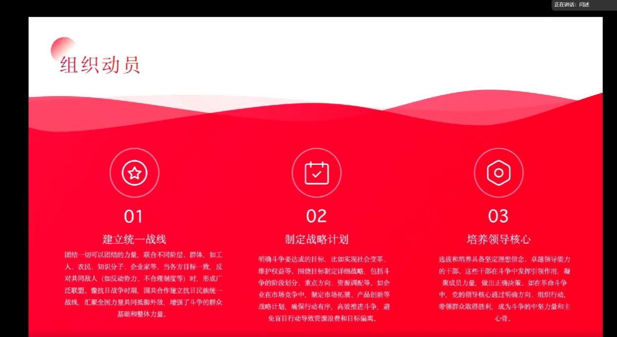 PP电子游戏网站PP电子游戏网站硕士生闫述同学作为首位导读人,从伟大斗争的定义、必要性、新特点、准备、目标与方向和实践与展望六个方面对《怎样理解必须准备具有许多新的历史特点的伟大斗争》的文本内容进行了深入浅出的解读。首先,她运用可视化分析和大家分享了关于伟大斗争定义相关的学术研究现状,帮助大家更好地了解当前的研究要点;其次,从历史背景的复杂性、斗争目标的明确性和参与主体的广泛性对伟大斗争的鲜明特点进行了系统的分析,内容丰富,逻辑清晰。最后,她提出斗争是推动历史前进的动力,只有通过斗争才能实现国家的繁荣、民族的复兴和人民的幸福。