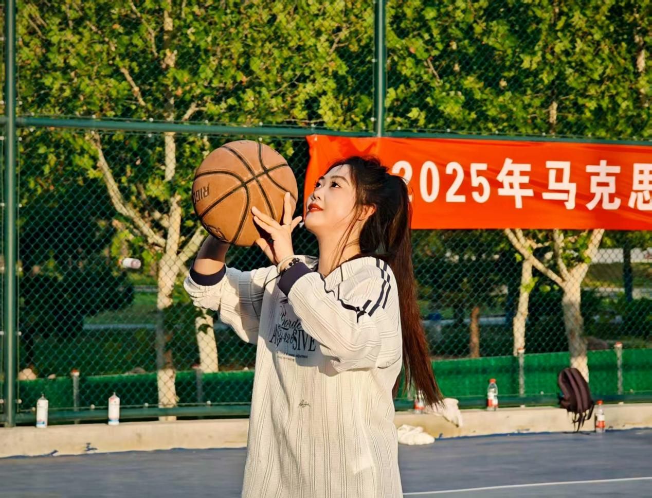 比赛中场休息时间,女生进行定点投篮,手起球落间,一道道优美的弧线划过球场。每一次进球都引得场下欢呼声此起彼伏,将比赛氛围推向了高潮。