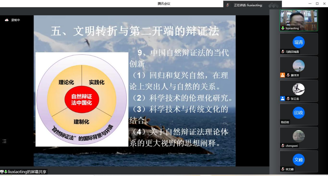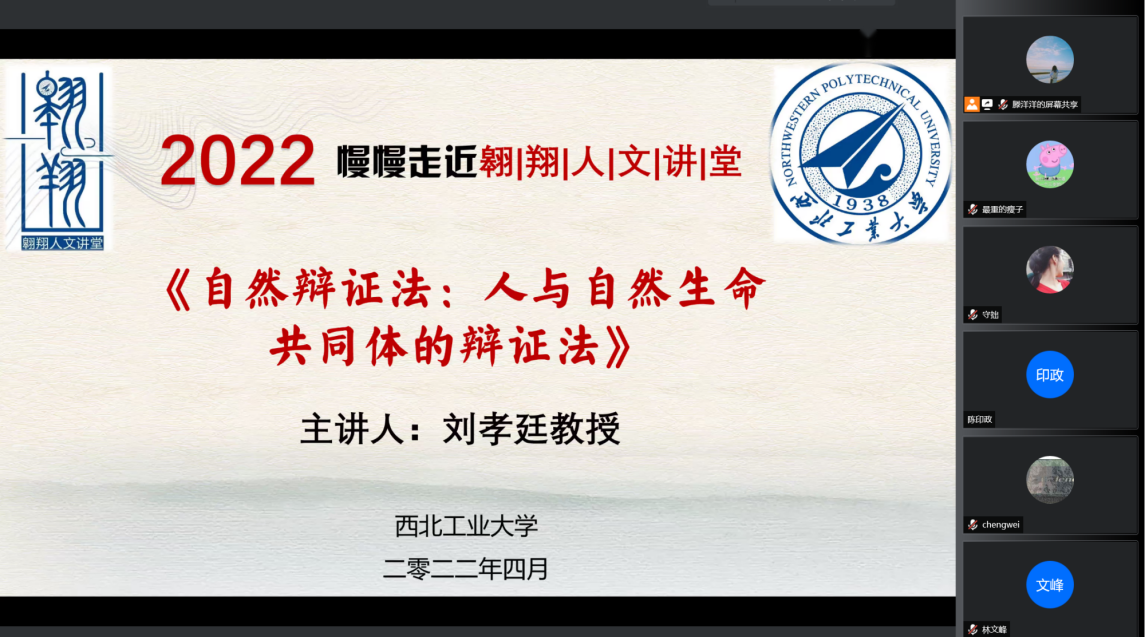 2022年4月22日晚19:00,教育部马工程首席专家、中国自然辩证法研究会副理事长、北京师范大学哲学学院刘孝廷教授应邀作客PP电子官网“翱翔人文讲堂”,通过腾讯会议平台直播的形式为我们带来了一场主题为《自然辩证法:人与自然生命共同体的辩证法》的精彩讲座。中国自然辩证法研究会理事长何鸣鸿、清华大学刘立教授、工程与社会发展专业委员会副主任、安徽大学王金柱教授、PP电子游戏网站师生以及来自全国高校的二百余名同学共同参与了此次报告会。本次翱翔人文讲堂由PP电子游戏网站党委学生工作部主办,PP电子游戏网站、工程与社会发展专业委员会承办,PP电子游戏网站副院长张云龙教授主持。