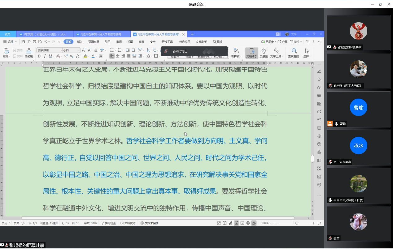 随后,结合学校和个人开展思政课教学、科研等工作的具体情况,每位党员同志轮流谈学习心得,共同探讨更好实现思政课教学效果的方式方法。丁社教教授指出,思政课的本质是讲道理,不能仅仅停留在一些形式性的创新上,还要想方设法把道理讲透、讲深、讲清;张云龙副院长强调思政课建设要在内容、方式、表现力等方面综合发力,同时要根据学校的基本情况,做具有一定特色的科研成果,要做有组织的科研;贺苗副院长讲解了学校在在线课程建设、教材建设等方面的相关政策支持,提出要结合西工大元素,建立更多新形态课程和新形态教材;王彦丽系主任认为思政课现在拥有一个良好的良好环境,思政课教师要有巨大的使命感和责任感。其他党员同志都从不同角度、不同层面分享了自己对此次重要讲话精神的学习感悟,交流了关于思政课改革创新的意见,畅谈了思政课教师发展的相关建议。