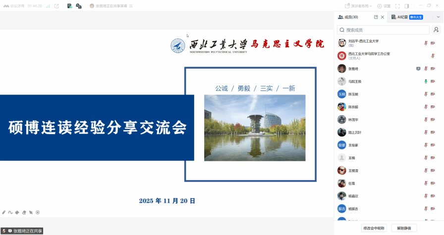 为帮助有意愿申请硕博连读的同学厘清升学路径,解答备考疑惑,缓解心理压力,PP电子游戏网站于11月20日举办线上硕博连读经验分享交流会。本次会议以“朋辈引领+政策解读”为主线,通过经验分享、政策剖析为学子们搭建高效互动、共同成长的交流平台,助力学生在学术深造的道路上行稳致远。硕士辅导员王换、研究生培养秘书肖妮及学院学生共同参与,会议由王换主持。