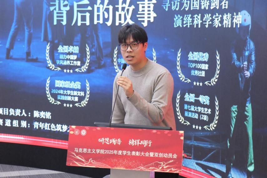 本次大会表彰了2025年度获得各级各类荣誉奖励的先进集体和优秀个人,包括在党内、团内表彰中获奖的集体5个、个人19人,国家奖学金获得者7人、专项奖学金获得者5人、校级奖学金获得者17人,校级先进集体4个,社会实践及双创竞赛先进集体17个、个人11人,学生工作先进个人28人。