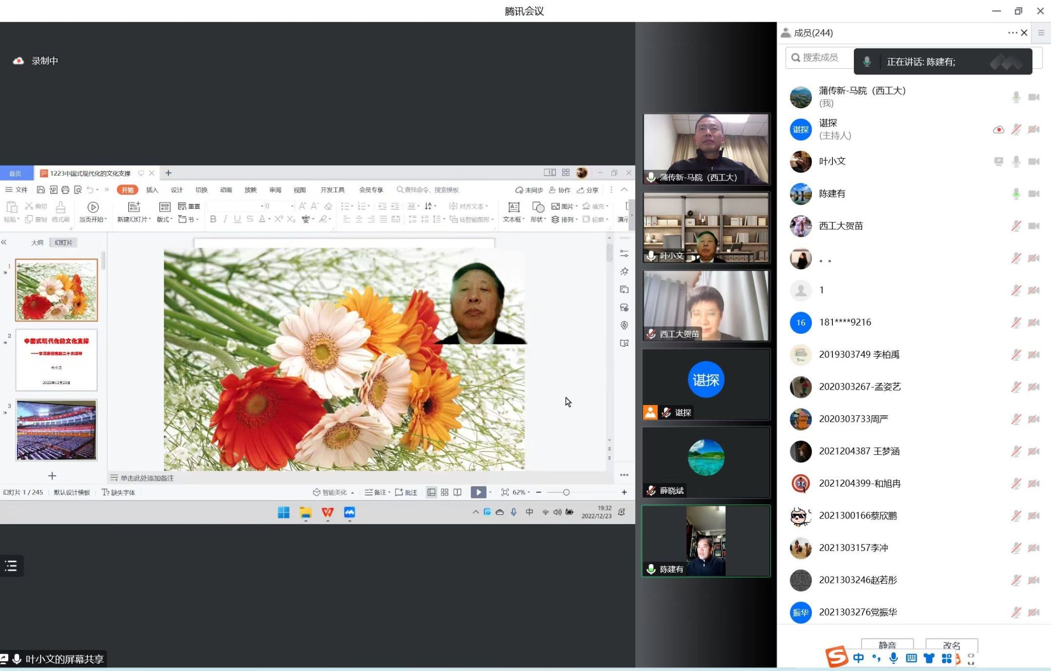 2022年12月23日,中国社会科学院宗教学博士,全国政协文史和学习委员会副主任叶小文作客PP电子游戏网站翱翔名家讲堂,在云端为PP电子官网广大师生带来一场主题为《中国式现代化的文化支撑——学习贯彻党的二十大精神》的精彩报告。来自PP电子官网逾300名师生参与讲座。本次翱翔名家讲堂由PP电子游戏网站党委学生工作部主办,PP电子游戏网站和陕西省重点舆情信息研究中心承办,学校党委副书记陈建有,PP电子游戏网站党委副书记(主持工作)蒲传新、副院长贺苗等参加了报告会。报告会由贺苗主持。