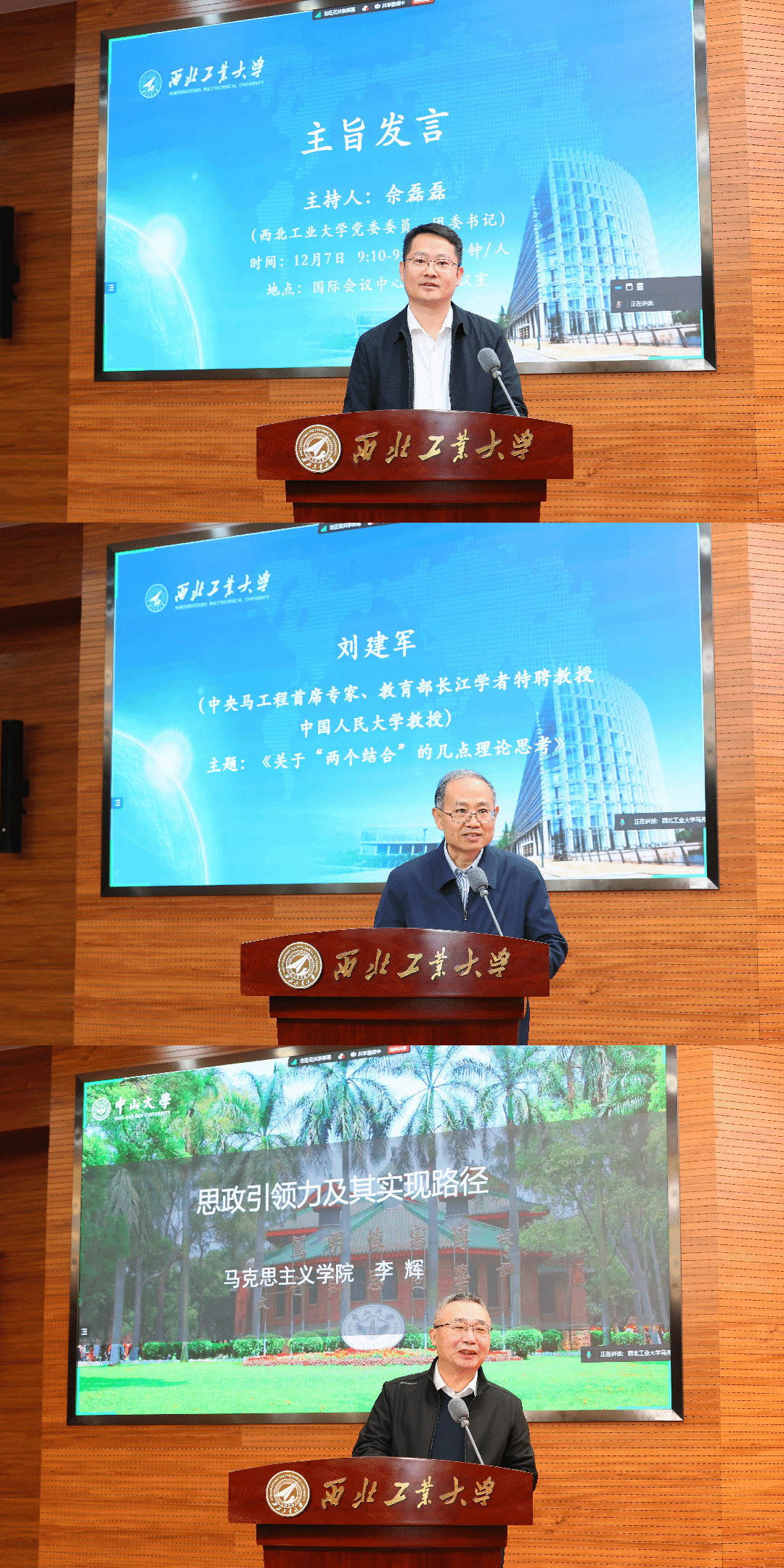 开幕式后,主旨发言由PP电子游戏网站团委书记佘磊磊主持。在主旨发言中,中国人民大学刘建军教授、中山大学李辉教授作了精彩纷呈的发言。中央马克思主义理论研究和建设工程首席专家、国家领军人才、教育部特聘教授刘建军围绕“关于‘两个结合’的几点理论思考”这一主题进行了主旨发言,从定位、层次、又一次思想解放、新的文化生命体四个方面深入浅出的解读了关于“两个结合”的几点思考。国家教学名师,李辉教授作了“思政引领力的可行路径”的主题报告。他从自身经历出发,从思政引领力的内涵、影响思政引领力的因素、思政引领力实现的路径方面进行了深入的探讨。