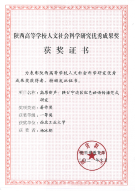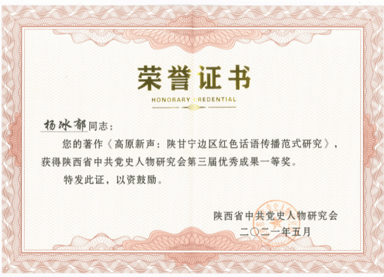 《高原新声:陕甘宁边区红色话语传播范式研究》一书入选 2019 年度教育部思想政治教育工作文库;荣获2021年度陕西高等学校人文社会科学研究优秀成果奖一等奖;2021年陕西省中共党史人物研究会、陕西省中共党史人物研究会第三届优秀成果一等奖。