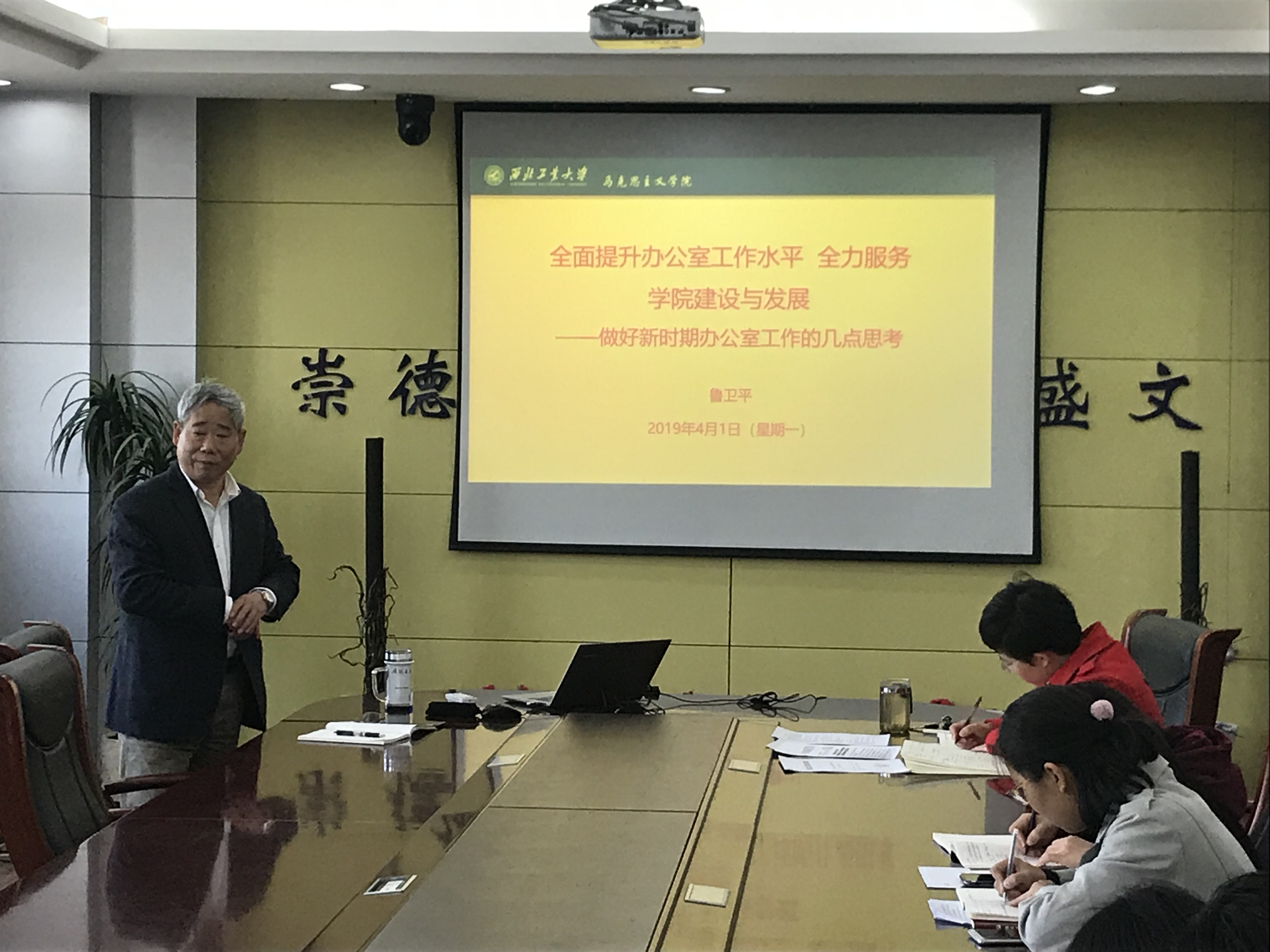 首先,学院党委书记鲁卫平为大家进行了专题培训《全面提升办公室服务水平,全力服务学院建设与规划》。他强调办公室是一个单位和部门的窗口、形象和面孔,处于协调各方、承上启下、联系左右的重要位置,在充分认识学院办公室工作的基础上要树立新时代办公室人员的使命和担当意识。鲁卫平同志结合自己丰富的工作经验和典型案例为大家详细讲了办公室人员的使命与担当的内涵,他建议大家深入思考自己工作,自觉学习理论知识,善于用理论武装头脑,提高自身业务素质和工作效率,在工作方式、理念上不断创新,并加强调查研究和学习,加强团结协作,齐心发力做好工作。