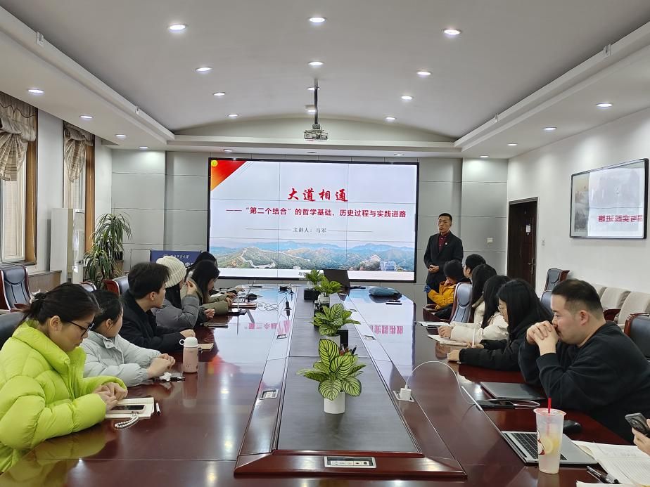 2024年12月9日下午,PP电子游戏网站PP电子游戏网站院长助理马军应邀在学院楼208会议室讲授“大道相通——‘第二个结合’的哲学基础、历史过程与实践进路”专题党课。本次党课由思想政治教育系党支部书记鲁杰主持,思想政治教育系党支部联合思想政治教育系硕士生党支部全体党员共同参与学习。在场师生学习氛围浓厚,讨论热烈。