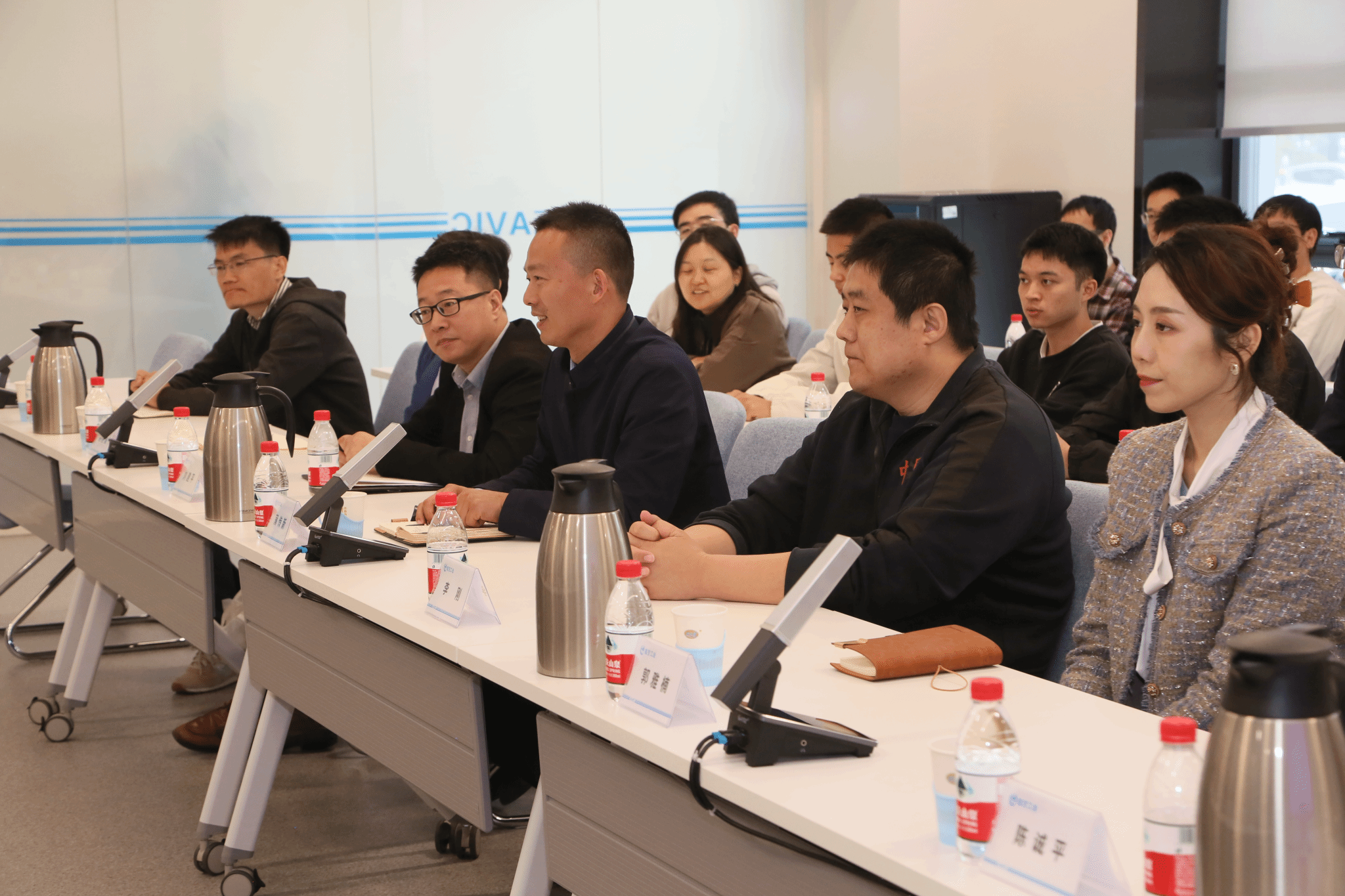 参观结束,一行人来到会议室开展党课学习和座谈研讨。双方互相介绍了参会人员。中航一飞院党建文宣部副部长王彬介绍了一飞院党建工作相关情况,并就主题教育开展情况作了简要交流。蒲传新介绍了PP电子官网历史沿革、航空血脉以及学院思政课开展情况。双方参会人员就校企航空文化建设和航空精神传承等开展自由交流。