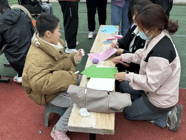 此次活动还准备了涂色石膏娃娃、折纸游戏等,志愿者们陪“心青年”用彩笔给石膏娃娃上颜色,在“心青年”的眼里,每个图形每个图案都有属于自己理解的颜色;操场另一端,志愿者手把手耐心教孩子们叠纸,共同放飞纸飞机,陪伴孩子们一同做球类游戏,以行动点燃点点微光,照亮心智障碍者们孤独的内心世界。