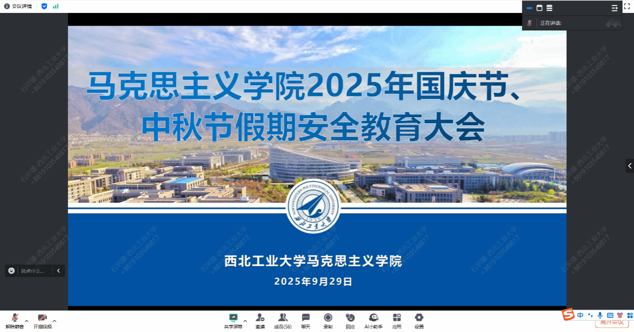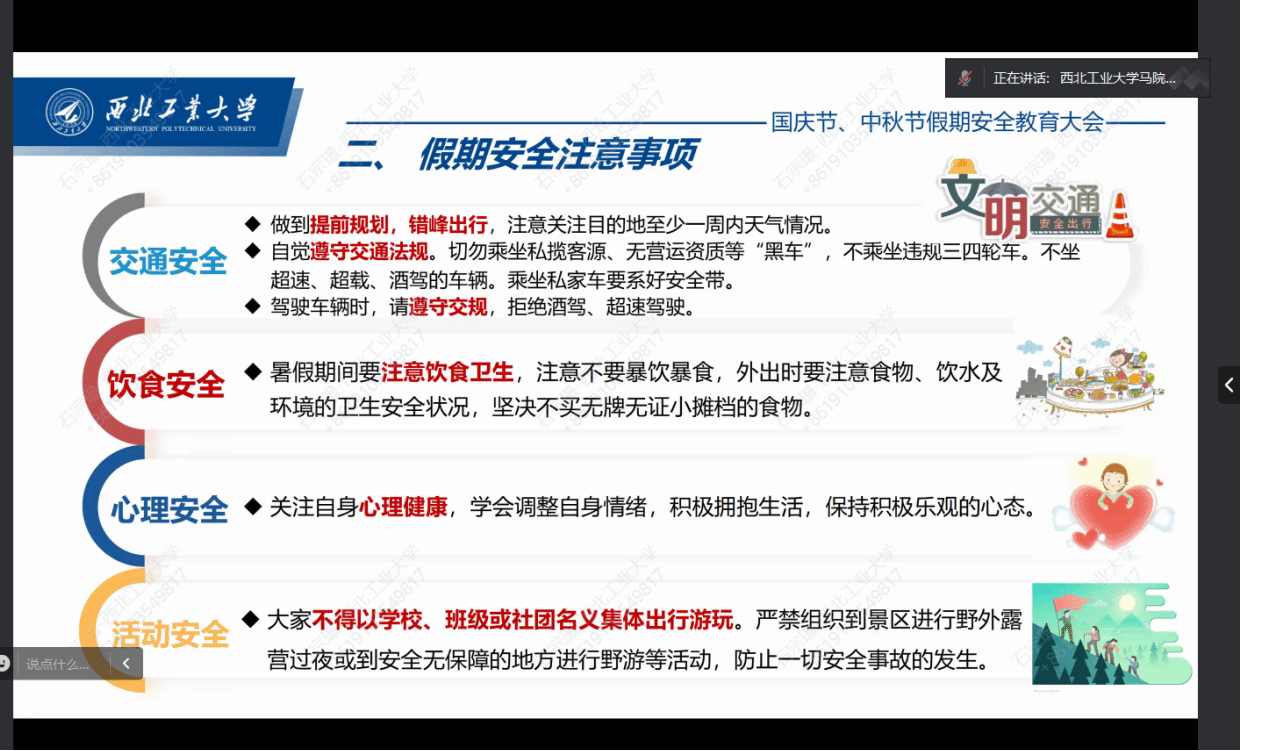 会上,刘敏首先传达了近期上级指导单位以及学校关于安全稳定工作的精神,并结合近期高校热点新闻,就学校双节假期离校与留校规定进行了再布置再要求,强调双节期间无论在校内外,均需严格遵守校规校纪,将安全意识入脑入心,保障人身与财产安全。随后,她围绕宿舍、交通、居家、财产等领域安全注意事项,要求同学们从思想上筑牢安全防线,从行动上落实安全措施,并特别提醒遵守校园交通规定,文明行驶以维护校园安全。硕士生辅导员王换、博士辅导员