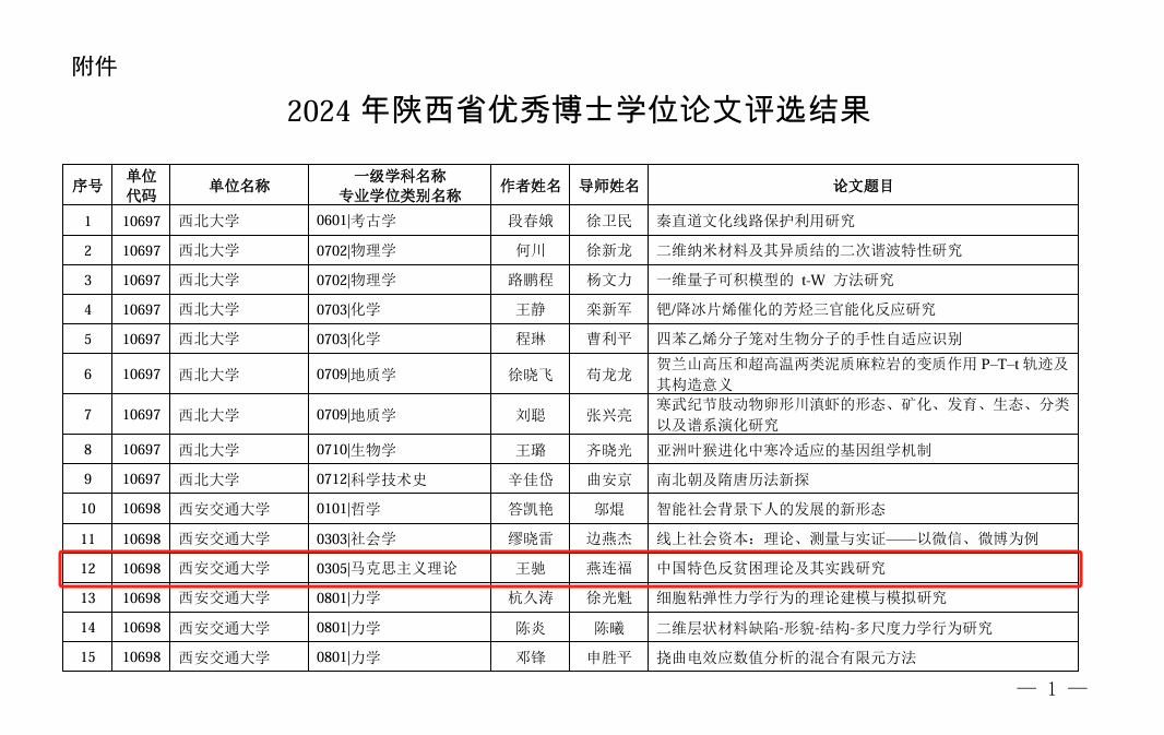 为提高博士研究生的创新能力,提升研究生培养质量,陕西省组织开展了2024年省级优秀博士学位论文评选工作。11月8日陕西省教育厅、陕西省学位委员会对评选结果进行公示。PP电子游戏网站PP电子游戏网站王驰老师、梁珊同学的博士学位论文《中国特色反贫困理论及其实践研究》(指导老师:燕连福)、《延安时期中国共产党思想政治教育话语建构研究》(指导老师:张云龙)双双入选。