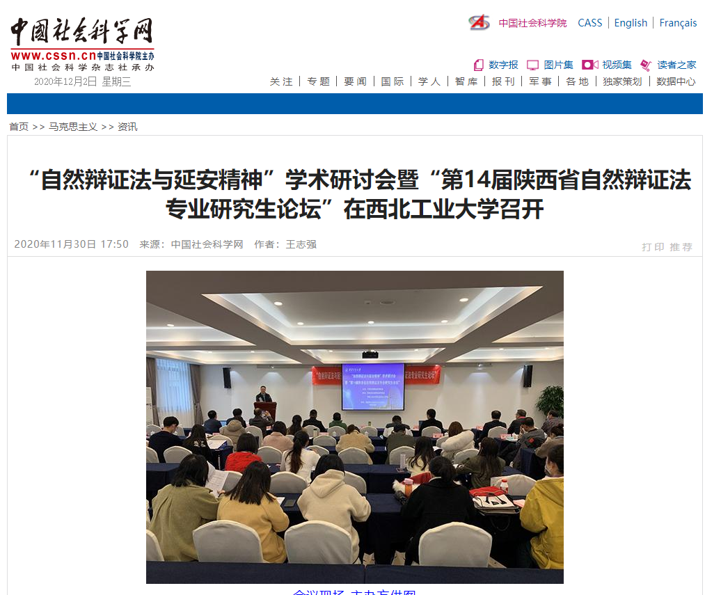2020年11月30日,中国社会科学网报道PP电子官网“自然辩证法与延安精神”学术研讨会暨“第14届陕西省自然辩证法专业研究生论坛”召开情况。