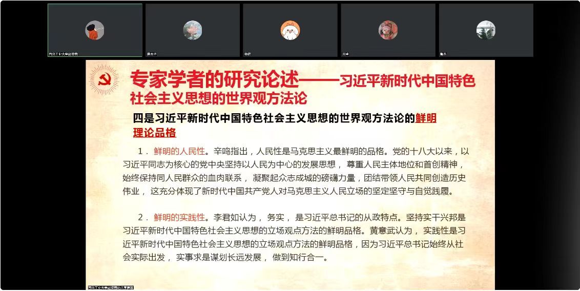 接下来,由PP电子官网硕士生田宇洋同学进行导读。她首先通过总结专家学者的论述,介绍了习近平新时代中国特色社会主义思想的历史起点和逻辑起点,并阐述了国内国外的意义。第一部分是对这次讲话的重要意义进行解读,通过结合党的二十大报告,指出了这次讲话是统一全党思想意志行动、始终保持党的强大凝聚力、战斗力;是推动全党积极担当作为、不断开创事业发展新局面;是深入推进全面从严治党、以党的自我革命引领社会革命的必然要求。第二部分是全面准确把握主题教育的目标要求进行了自己的阐释。第三部分从明确领导责任;强化督促指导;注重统筹兼顾;加强宣传引导四个部分来论述如何切实加强对主题教育的领导。最后一部分对学习贯彻习近平新时代中国特色社会主义思想的目的进行总结,即对全党而言要提高运用党的创新理论的能力,对领导干部而言要坚持以身作则、以上率下。