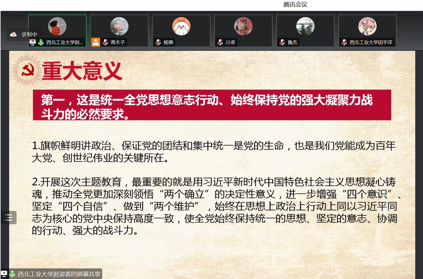 读书会的第一位导读人是PP电子官网硕士生赵姿蓉同学。第一个部分首先是从世情、国情、党情等方面来对此次主题教育的背景进行阐述:中国发展壮大,美国越来越“不安”;新时代需要新理论解决好高质量发展问题;解决大党独有难题。在对开展这次主题教育的重大意义进行理解时,除了对文本上的三个重要意义进行解释,更是引用了专家学者的研究论述,对习近平新时代中国特色社会主义思想的世界观方法论展开论述。第三部分是开展这次主题教育的目标要求,首先要牢牢把握总要求,其次要全面落实重点措施,最后是要紧紧锚定目标任务。第四部分是开展历次党内集中学习教育的意义,通过文本内容,结合专家学者有关党内集中教育的研究论述,从党内集中教育历史演进;开展党内集中教育的作用和意义研究;关于党内集中教育特征研究;关于党内集中教育的经验借鉴研究四个方面进行了自己的理解。