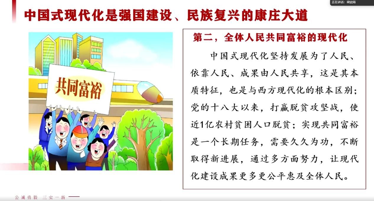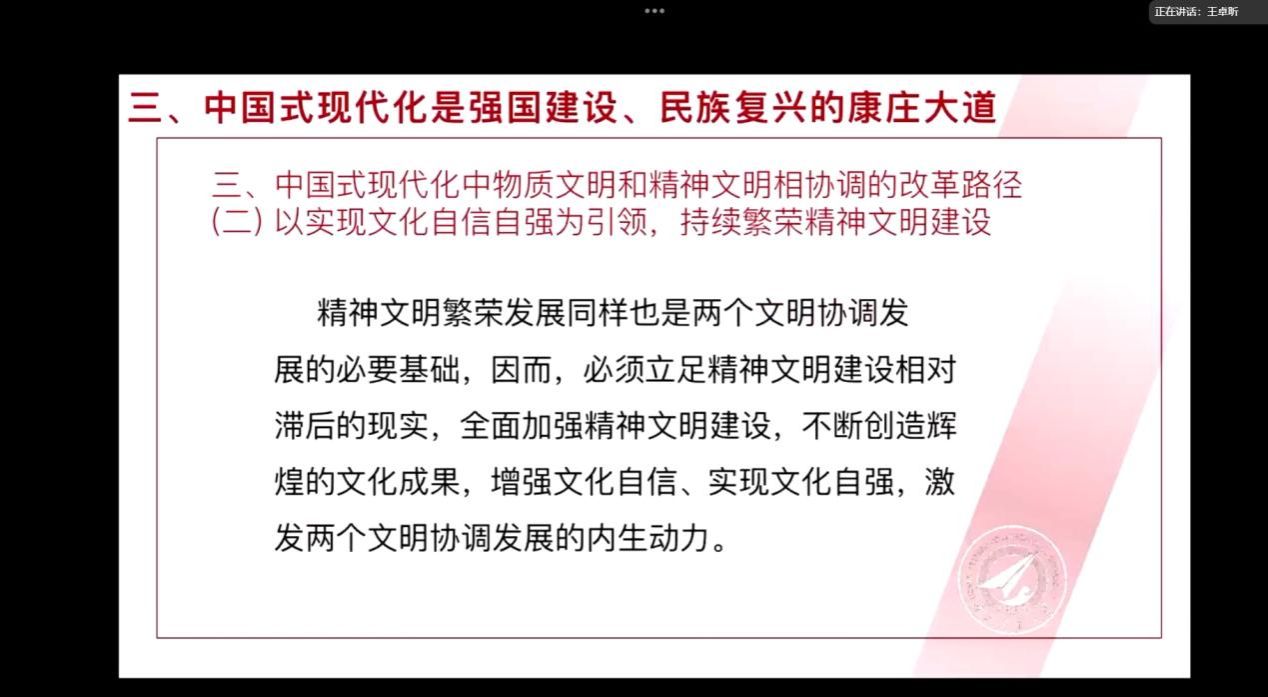 PP电子游戏网站PP电子游戏网站硕士生王卓昕同学作为首位导读人,在认真研读《以中国式现代化全面推进强国建设、民族复兴伟业》文本内容的基础上,围绕中国式现代化是强国建设、民族复兴的康庄大道这一点,通过文献资料收集整理,把相关的一些观点进行了系统梳理,内容丰富、逻辑清晰,与大家进行了学习分享。推进中国式现代化是一个长期的任务,还有许多东西需要认识深化,要不断加强理论研究和实践探索。