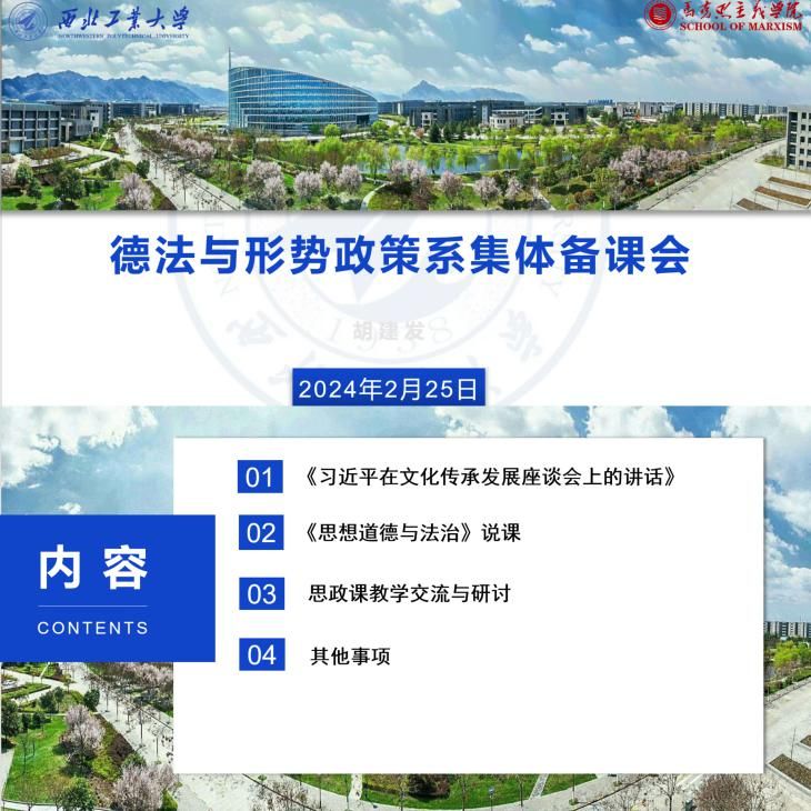 德法与形势政策系《思想道德与法治》课程组于2月25日召开新学期第一次集体备课会,会议由系主任胡建发主持,全体授课教师参加会议。胡建发副教授首先强调了课堂融入习近平文化思想的重要性,要积极探寻“总师育人文化”与课堂内容的契合点,并向全体授课教师分享了《习近平在文化传承发展座谈会上的讲话》及个人心得。接着,新进教师就《思想道德与法治》课程绪论、第一章及第二章的部分进行试讲。最后,与会教师针对重点教学专题进行商讨,高宝营副教授、李秀萍副教授、柴岳春副教授分别就课程内容、课堂纪律、课后作业等管理方面进行经验分享。本次备课会进一步统一了思想,明确了“总师育人文化”融入思政课教学目标,为今后教学工作的顺利展开提供了有力保证。