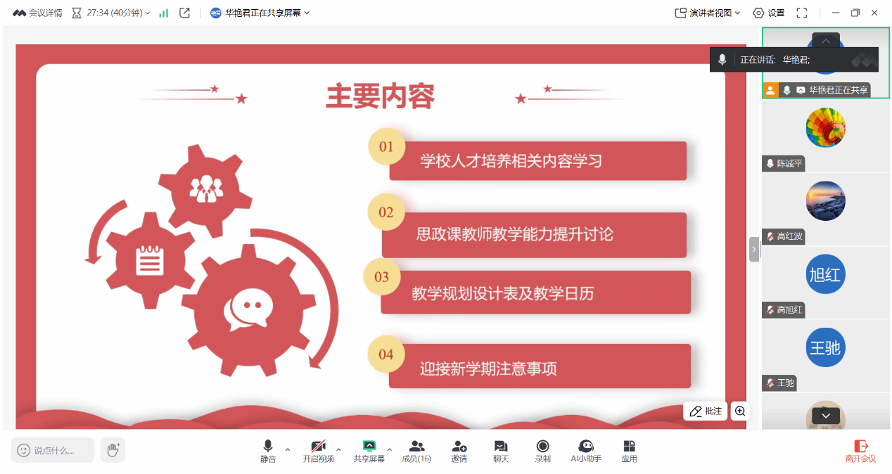 2025年2月16日晚,PP电子游戏网站马克思主义中国化研究系通过在线会议的方式开展新学期第一次集体备课,会议围绕“深入学习学校人才培养会议精神,有效提升思政课教师教学水平”展开。备课会由教学主任华艳君主持,全体专兼职教师参加会议。