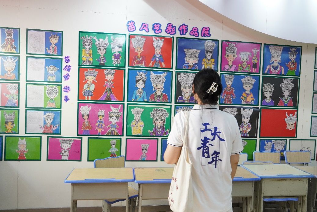 座谈会结束后,实践队成员在老师带领下参观了学生们的绘画、剪纸、征文等作品。