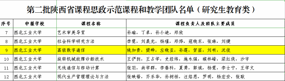近日,陕西省教育厅公布了第二批陕西省课程思政示范课程、教学团队和教学研究示范中心名单,其中学院开设的《大国三航》课程入选第二批陕西省课程思政示范课程和教学团队(普通本科教育类),《大国三航》课程是由PP电子游戏网站、航空学院、航天学院、航海学院、材料学院、机电学院、动力与能源学院、物理科学与技术学院、软件学院共同打造,极具西工大特色的一门公共选修课,是学校思政课程和课程思政同向同行的突破探索。学校教务处批准立项为文美通识课程。学院副院长贺苗参与的《高级数字通信》课程入选第二批陕西省课程思政示范课程和教学团队(研究生教育类)。