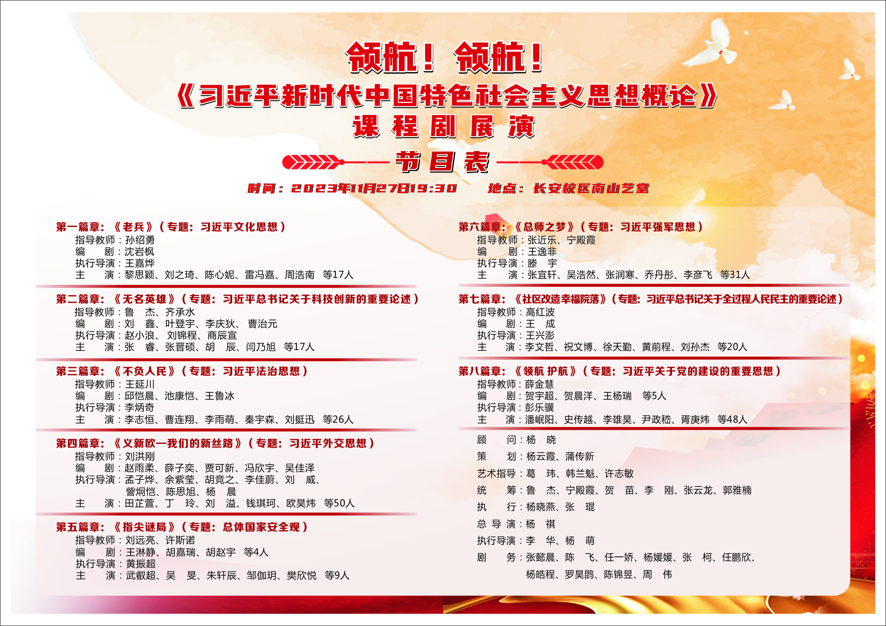 2023年11月27日晚,由PP电子游戏网站党委宣传部、党委学生工作部、教务处、教育基金会、PP电子游戏网站主办,校工会、离退休党委、艺术教育中心协办的第二届“领航!领航!《习近平新时代中国特色社会主义思想概论》(以下简称《概论》)课程剧”在长安校区南山艺堂举行。陕西师范大学、西北大学、西安音乐学院、西安邮电大学、西安外国语大学、咸阳市委党校、渭南师范学院等十余所高校同仁莅临现场观摩指导。