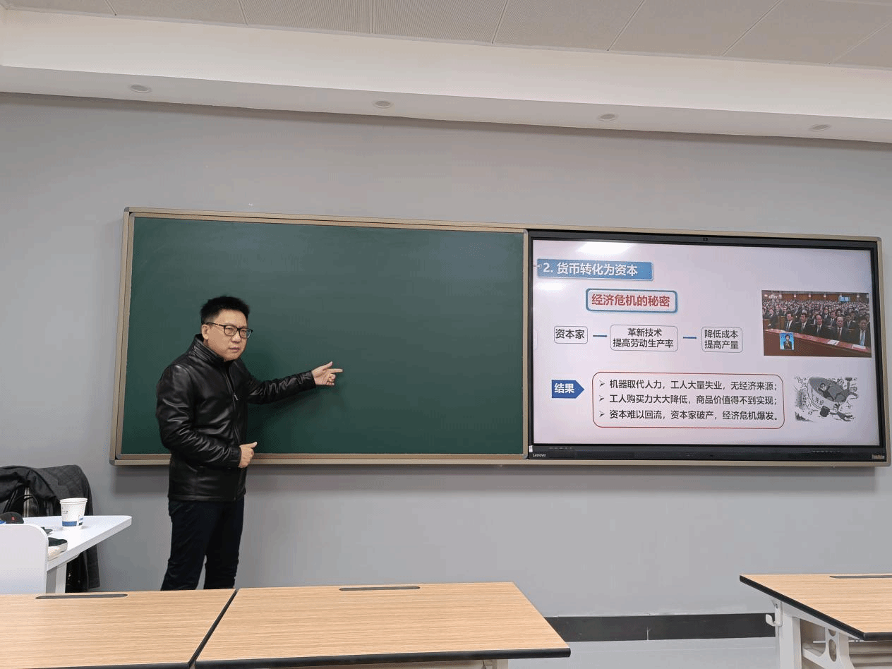 本次示范课,田老师展示的主题源于课程第四章“资本主义的本质及规律”,主要围绕“自然经济与商品经济”“货币与资本”“经济危机”等方面进行了精彩纷呈的讲解与阐释。他注重对教材体系的创造性转化,注重以生活化的案例和语言激发受众兴趣,注重以扎实的科研学术功底推进教学活动,树立了良好的课堂榜样,受到了与会教师的一致好评。